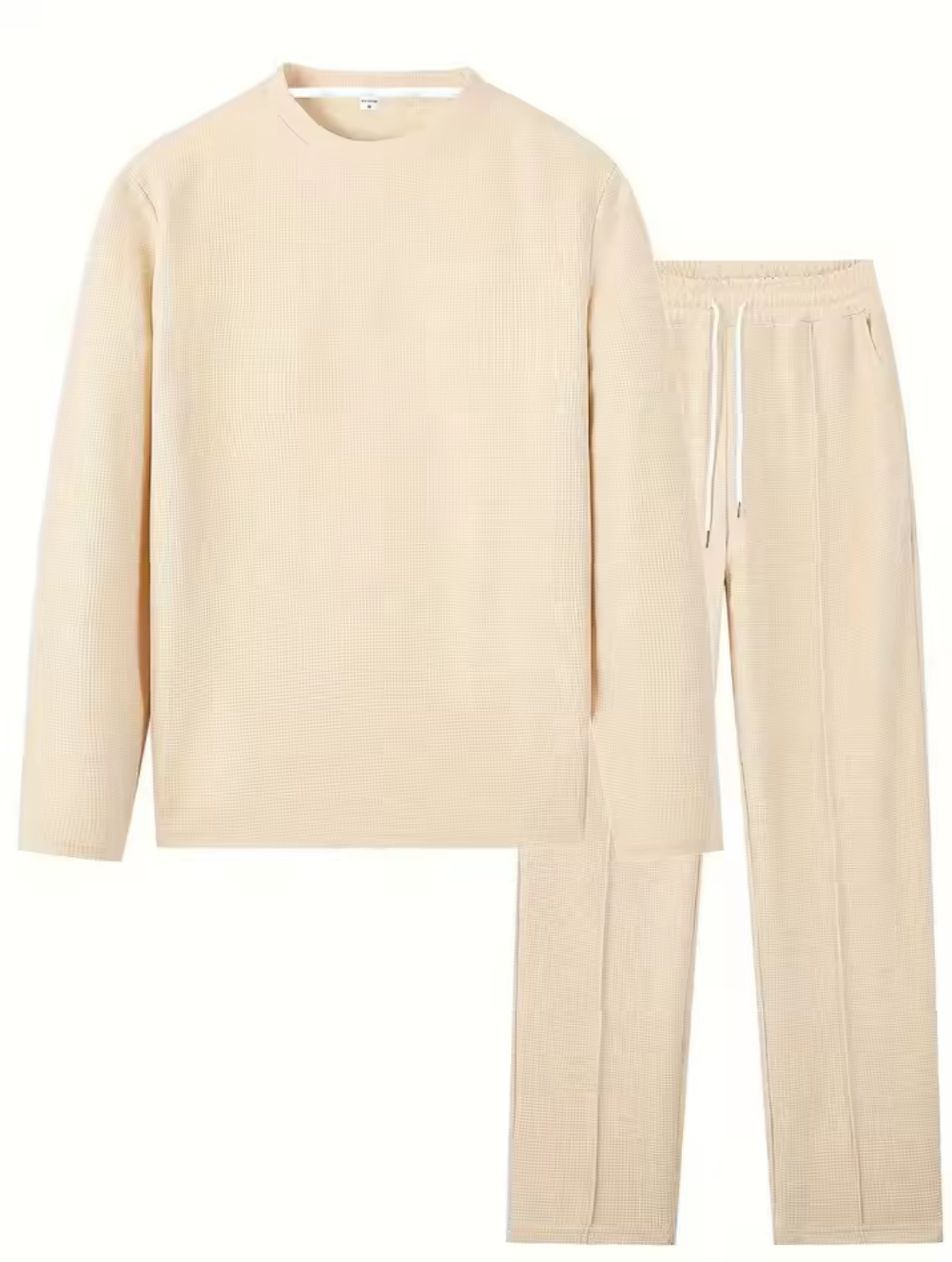 Detta 2-delade set med långärmad tröja och matchande byxor är det perfekta valet för dig som vill kombinera stil med komfort. Setet är tillverkat i ett mjukt, stretchigt material med en subtil textur som ger ett exklusivt intryck. Perfekt för både hemmabruk och avslappnade vardagslooks – addera ett par sneakers så är du good to go.