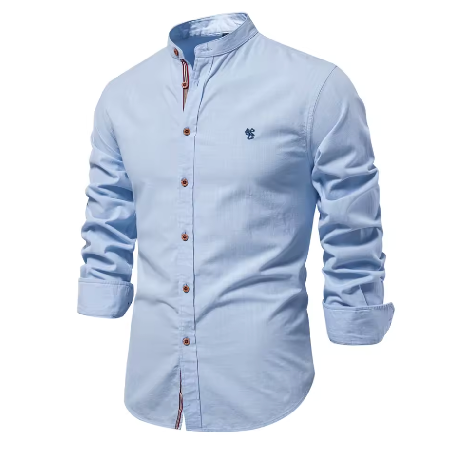 Den perfekta kombinationen av elegans och avslappnad stil. Denna skjorta med ståkrage (kinakrage) är ett måste i varje modern mans garderob. Med sin välsittande passform, trendiga design och stilrena knappar passar den lika bra till jobbet som till middag eller fest.