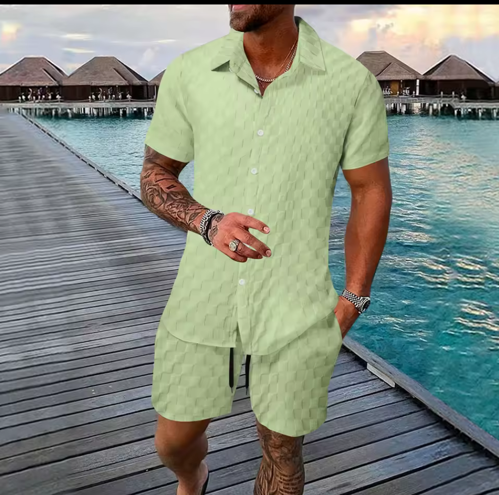 Stilren Sommarset – Kortärmad Skjorta & Shorts i Ljusgrön Struktur