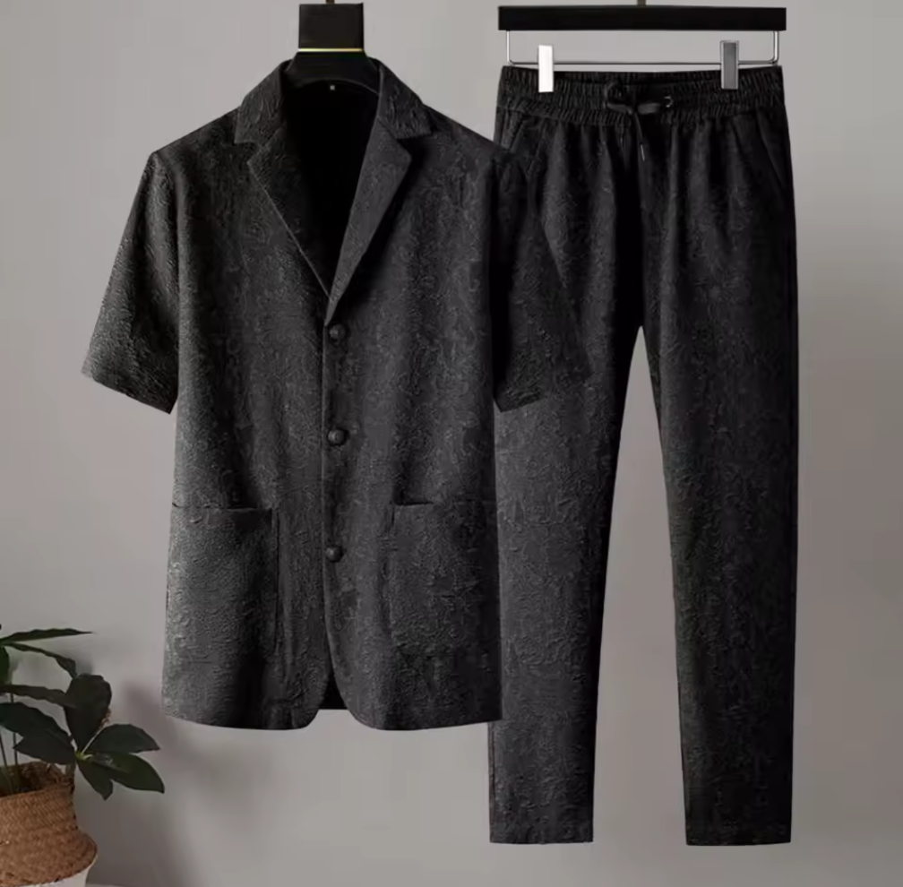 Stilrent herrset med spetsstruktur – kortärmad blazer & byxa (vit eller svart)