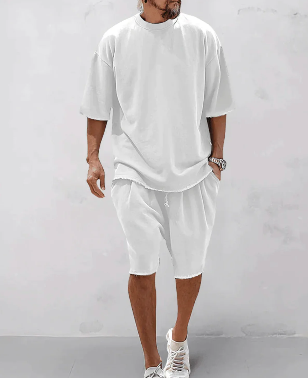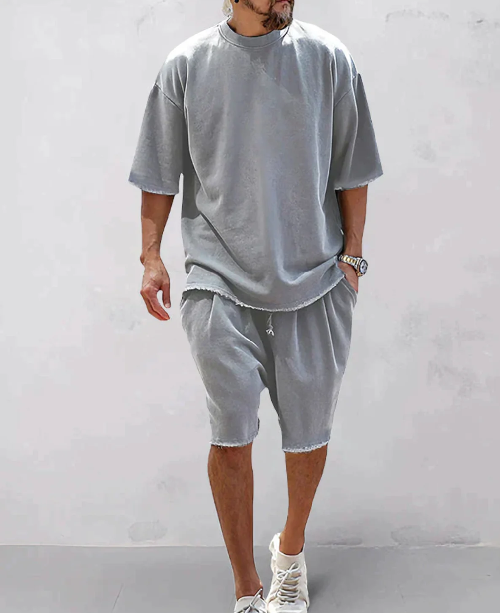 Ge din garderob ett uppdaterat lyft med detta trendiga tvådelade set som kombinerar komfort och streetstyle på bästa sätt. Setet består av en oversized t-shirt med råa kanter och matchande shorts med resårmidja och dragsko för perfekt passform. Det tvättade tyget ger en lätt vintagekänsla, medan den lösa siluetten skapar en avslappnad men stilren look – idealisk för både stadshäng, semester och avslappnade vardagar.